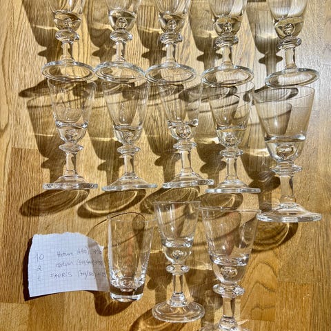 Glassene selges fortrinnsvis samlet, men kan vurderes solgt i mindre sett (f.eks. 6 stk.).