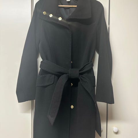 Selger en stilren og tidløs sort kåpe fra H&M i størrelse 38. Kåpen har en figursydd passform med belte i livet som gir en flatterende silhuett. Den er like fin til jobb som til hverdags og penere anledninger.