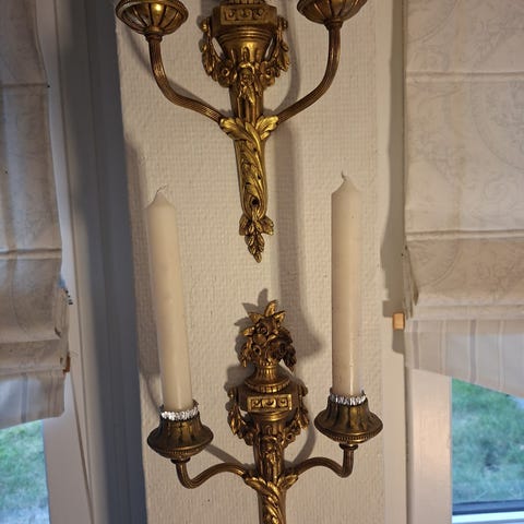 Et par dekorative vegglysestaker med doble lysholdere, i messing og med speil i bakkant. Disse har vel en vintage, rokokko eller barokk stil. Alder vites ikke, men ikke av nyere årgang, har patina, som ikke er forsøkt fjernet. Se bilder!