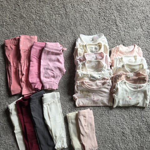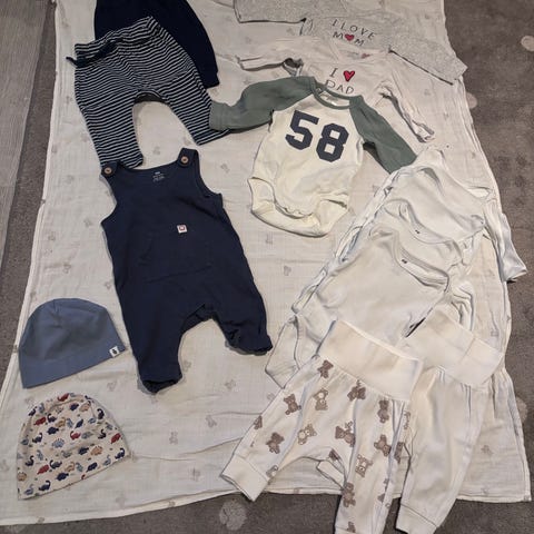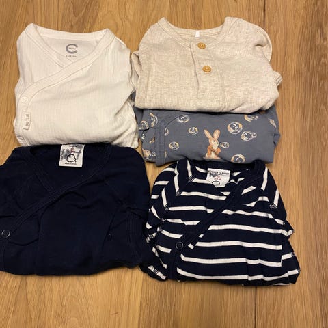 5 stk omslagsbodyer og 5 bukser (2 stk med fot). Fra Fixoni og HM. Den ene bodyen mangler den nederste trykknappen, se bilde. Går fint så lenge man trekker buksen over.