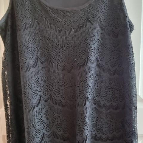 Kort kjole uten armer. I type brodert/brokade stoff. Litt tykk i stoffet, så passer godt nå