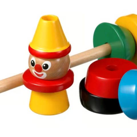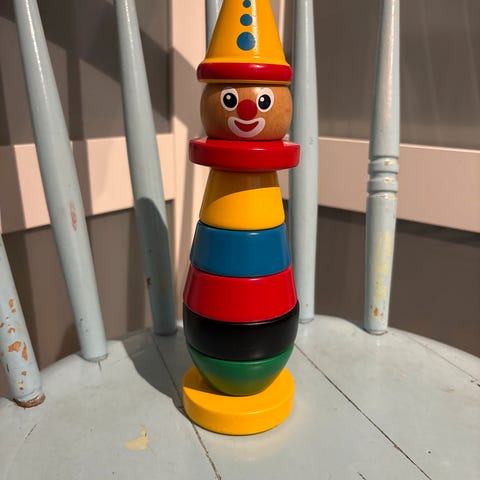 Klovn i tre med flere deler som kan stables fra Brio. Versjon med rød og hvit.