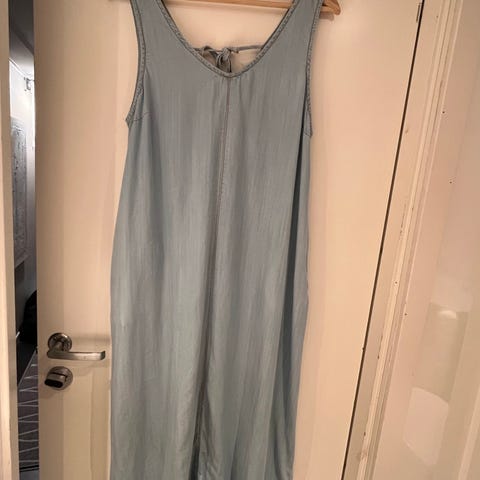 b.young Sommerkjole i blå denim, størrelse 38 for kvinner. Kjolen har tynne stropper og en løs passform med volang nederst. Passer flere str grunnet justerbare stropper. Lite brukt!