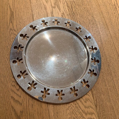 Alessi Girotondo serveringsfat med diameter på 40 cm i rustfritt stål. Designet av Stefano Giovannoni og Guido Venturini, kjent for sin karakteristiske dekor med små figurer rundt kanten. Passer til servering og dekorasjon. /dette er fra 80-tallet - noe ripete .