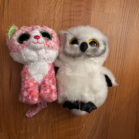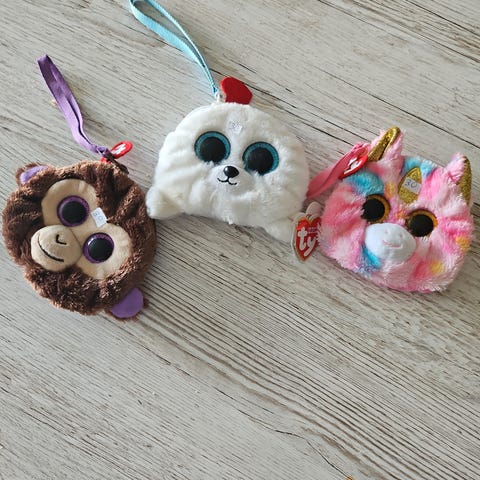 Ty nøkkelring og bamse med ulike farger og mønstre. Den ene er rosa med lilla og blå prikker, den andre er hvit med fluffy pelsdetaljer. Begge har store øyne og den ene metallnøkkelring for enkel festing.