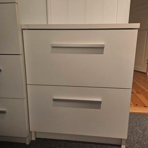 Profilerte hvit malte nattbord. Har hylle og 2 skuffer. Har 2 stk . Pris er pr stk. Uten knott/,håndtak , vellg knott/håndtak selv. Lett å male i ønsket farge.