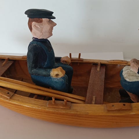 Signert skulptur av Eyvind Kornstad som viser en fisker sittende i robåt med årer. Meget fine detaljer som viser fiskerens redskap, årer og fisk i båten.
