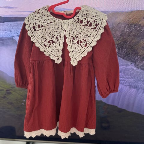 Nydelig julekjole til jente med søtt forkle til. Kan brukes sammen eller hver for seg. Ingen synlige bruksmerker.