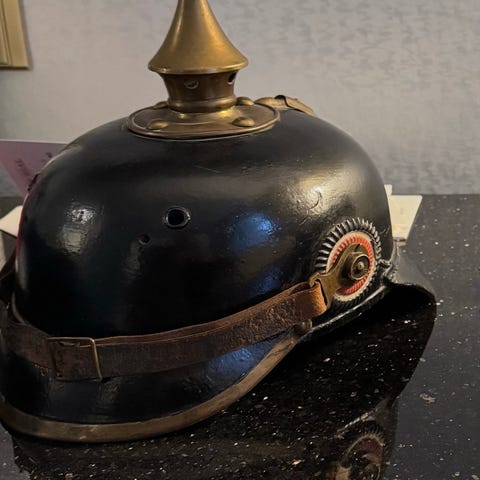 Tysk picklehaube (pigghjelm) som brukt ved den første verdens krig. Replika.