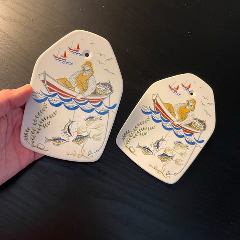 3 stk Brikke, smørefjøl, asjett. Bilde. Pynt .Forskjellige motiver fra torskefiske