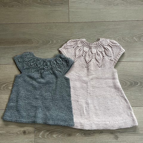 Aprikos/rosa Dahliagenser. Strikka i Kos og mohair. Ste 8-10 år