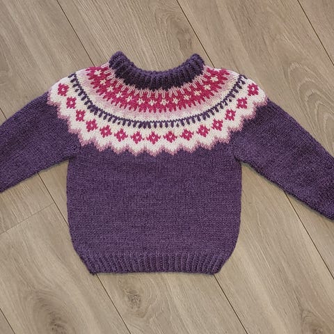 God og tykk hjemmestrikket ullgenser med beige bunnfarge og mønster i lilla, rosa og burgunder. Strikket med pinnestørrelse 5,5 - 6.