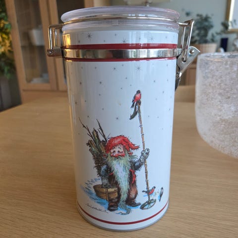 Stor kakeboks med julemotiv, dekorert med snømenn og vinterlandskap. Høgde 26 cm, bredde 7 cm og dybde 27 cm.Boksens ytre har blå bakgrunn med snøfnugg og fjell, og den har et lokk som kan åpnes. Selges kr 200