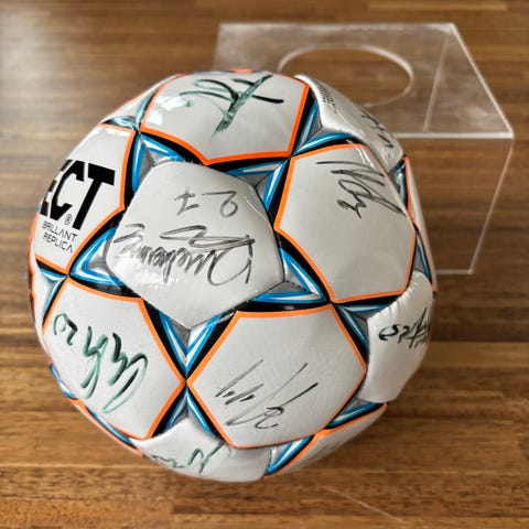 En offisiell fotball, unik signert av en rekke norske toppspillere fra 1989, samt fotballens ubestridte konge Pelé.