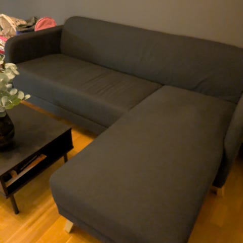 Praktisk og komfortabel hjørnesofa i mørk grå stoff selges. Sofaen har god sitte- og liggekomfort og passer fint både i stue og gjesterom. Den kan brukes som sovesofa og gir god plass til avslapning.
