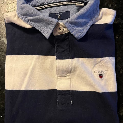 GANT Barstripe langermet genser i blå og grå striper laget av bomull. Passer for gutter i størrelse 134/140, 9-10 år. Genseren har langarm og en klassisk stripete design. Liten og pent brukt.