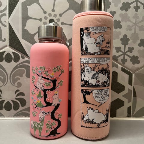 Hadeland Glassverk Moomin vannflaske med en kapasitet på 0,5 liter. Flaska er laget av glass og leveres med beskyttende trekk. Designet har motiv fra Mummifigurene Snorkmaiden og Snorkfrøken.