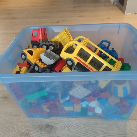 Diverse LEGO DUPLO med blant annet en dinosaurfigur med tilhørende tårn, kjøretøy, menneskefigurer, biler, traktorer og et fly.