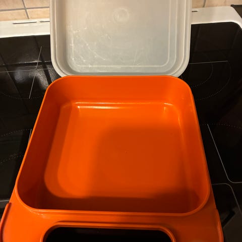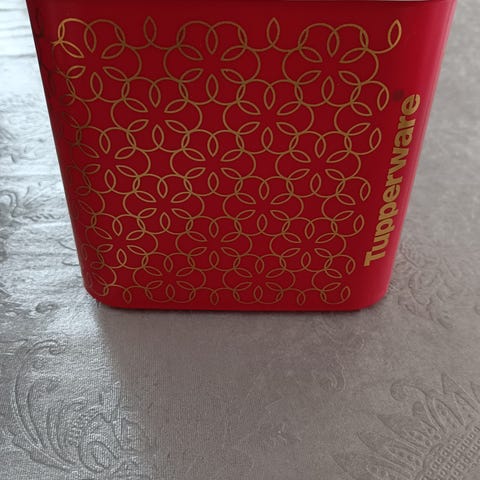 Festboks tupperware . Den burgunder som ny, den blå noen striper i underlikket hvor kaken har blitt skjert opp. Har ingenting å si for oppbevaringen. Er bare at den er blitt mere brukt. 450 pr stk. kaffe kanne 250 kr også tupperware
