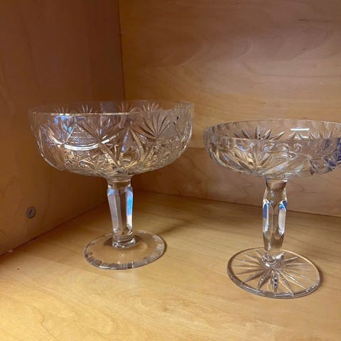 Krystallglass krukke med hank, gjennomsiktig materiale, dekorativt mønster. Egnet for oppbevaring eller dekorasjon.