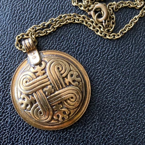 Halskjede i bronse, signert Eivind Hillestad. Diameter på anheng: 5 cm. Lengde på kjedet: 42 cm fra halsen og ned. Litt eiret på høyre side, se bilder.