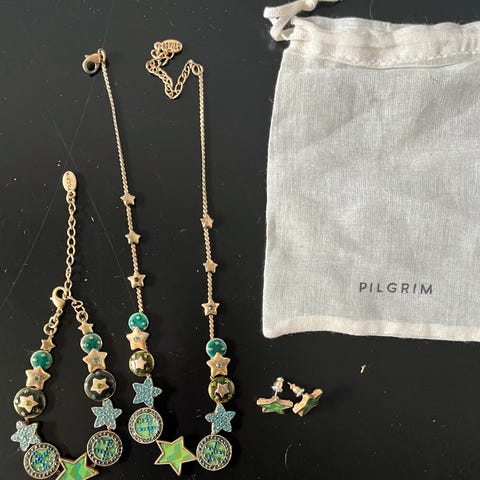 Pilgrim dame smykkesett laget av sølv og andre materialer. Settet inkluderer ulike smykker som ringer, øredobber og kjeder, egnet for daglig bruk eller spesielle anledninger.