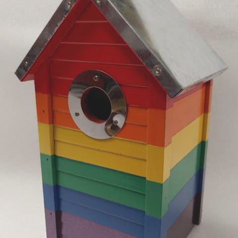 Høyde: ca 50cm, bredde: ca 40cm, dybde: ca20cm. Med stativ til oppheng. Kan åpnes i siden for rengjøring. Hull: Ø3,4cm. Passer blant annet meisefugler. En pryd for hagen.