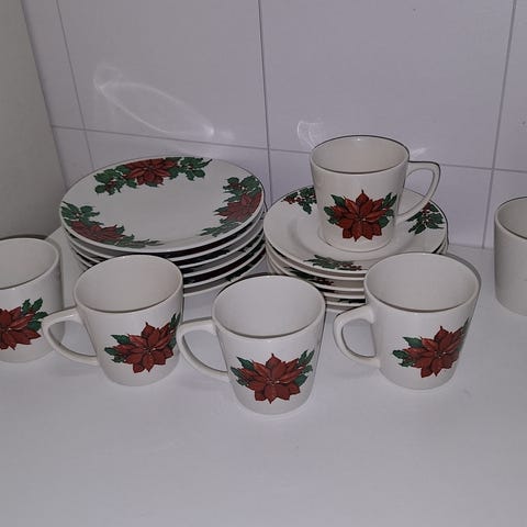 Selger kaffeservise med nisse og reinsdyr. Fine porselen. 6 personer.