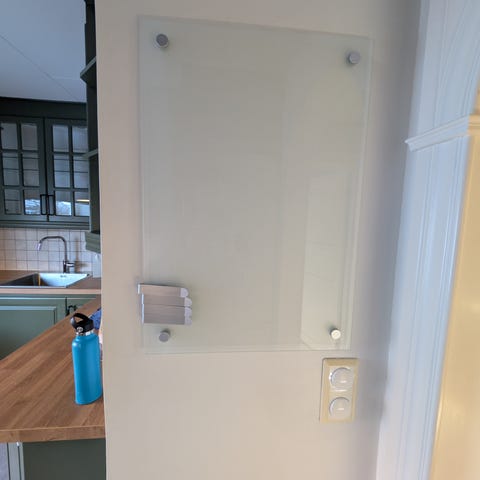 Lekkert chatboard i lyseblått/grått glass. Dette er en magnetisk tavle i str 40 x 50 cm. Ny pris 1250,-