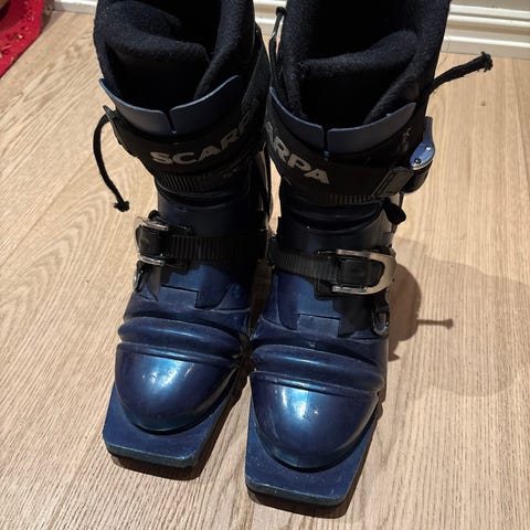 Scarpa T2 telemarkstøvler i størrelse 6. Solide og komfortable støvler, kjent for god passform og kvalitet fra Scarpa. Brukt, men i fullt brukbar stand. Se bilder for detaljer og slitasje.