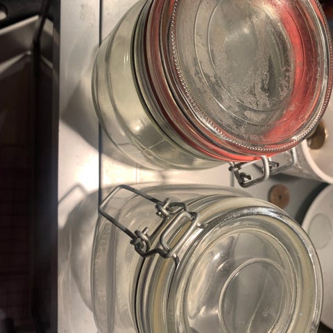 IKEA glasskrukker med klemmeglasslokk i ulike størrelser. Egnet for oppbevaring av matvarer og kjøkkenutstyr. Krukkene er laget av klart glass med metallklemme for tett lukking.