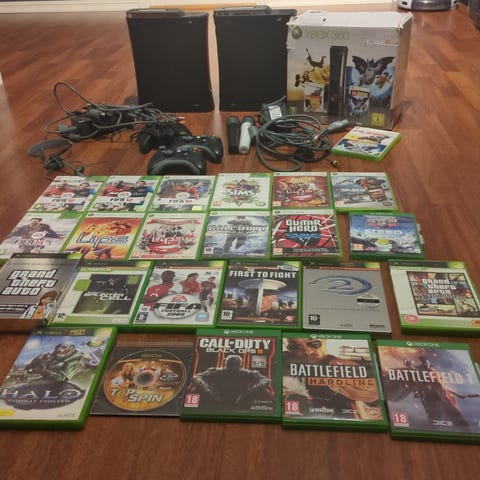 Xbox 360 spillkonsoll med en godt brukt kontroller, strømkabel, AV cabler og 24 stk spill