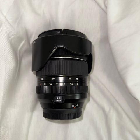 Fujifilm XF 16-80'mm f/4 - 16/f. Et objektiv med optisk bildestabilisering og værbestandig konstruksjon. Objektivet har en brennvidde på 16-80'mm og en regulerbar blenderåpning fra f/4 til f.16 egnet for vidvinkelbilder, landskap og reise. Passer til Fujifilm X-serie kameraer.