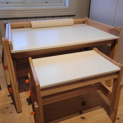 barnestol laget av tre. Stolen har en enkel og robust konstruksjon med ryggstøtte og sete i trelameller. Egnet for barn.