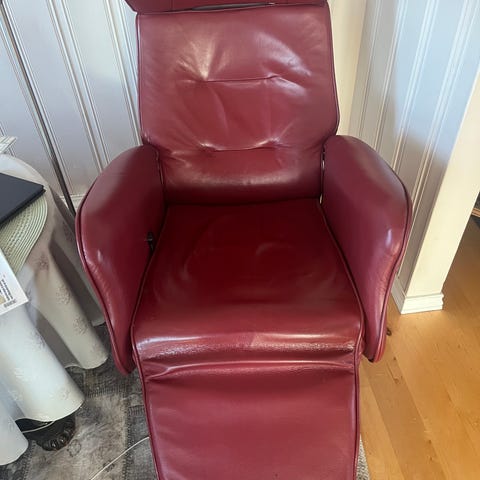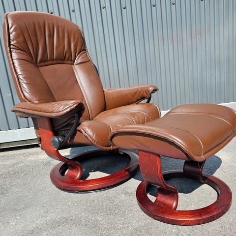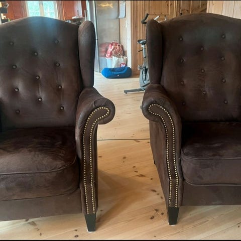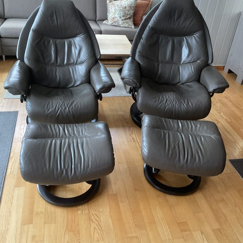 Lenestoler i skinn med fotskamler.