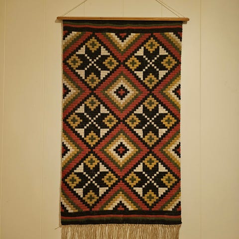 Håndvevd gobeleng / veggteppe med geometrisk mønster i varme jordtoner.