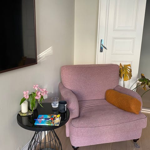 Høy lenestol - "bestemor-stol" - m/ skammel