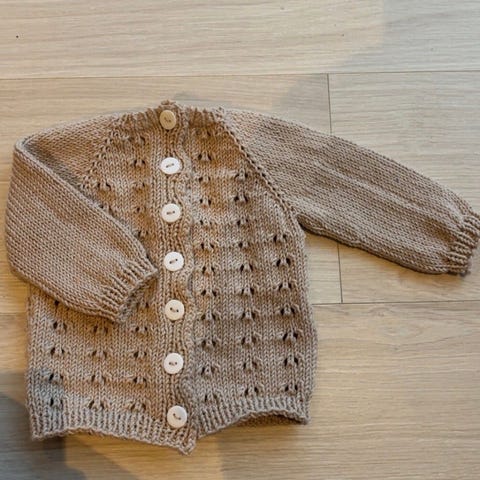 Hjemmestrikket kirsebærjakke i str 0-3mnd. Strikket i ullgarn og med treknapper.