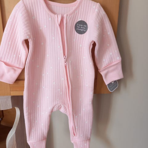 God og myk lyseblå sparkebukse med søt blondekrave. Den har føtter og lange armer (ca 45 cm lang), buksa har to trykk-knapper bak på ryggen og trykk-knapper i kilen for enklere bleieskift, bomull/polyester, str 3-6 mnd (62/68). Kjøpt i England. God kvalitet. Flott vinterantrekk.