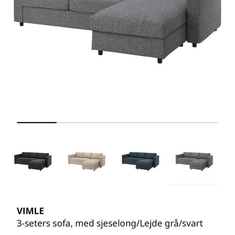 Vimle sofa fra IKEA med sjeselong selges billig. Sofaen er helt fin, knirker littegranne på et punkt, men sikkert mulig å smøre litt. Trekket kan vaskes i maskin🤩