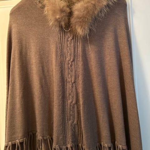 Dame mørk lilla poncho med flettet striper av rev skinn