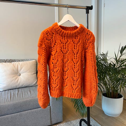 🧡Hjemmestrikket Kristianes høstgenser selges da den ikke brukes. Strikket med garnet Pus og Faerytale fra Du Store Alpakka. Genseren er str Small og er lite og pent brukt, noen nupper kan forekomme. Inspirert av Ganni. Selges for 500kr.