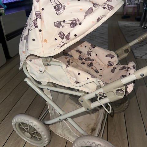BRIO dukkevogn med mønstret trekk i rosa, blått og hvitt. Dukkevognen har justerbart håndtak og fire hjul. Trekket har mønster som gir et fargerikt utseende. Håndtaket har slitasje. Se bilder. Passer til lek og rollelek for barn.