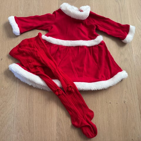 Morsom julekjole i bomull (38 cm lang) med lange armer og reinsdyret "Rudolf er rød på nesen" motiv, lukkes med 3 knapper foran. Et par strømpebukser/tights følger med. Str 62/68 (3-6 mnd). God kvalitet. Kjøpt i England og er fra merket Next. Flott kjole til både juleselskap og nyttår, og når det skal tas julebilder.