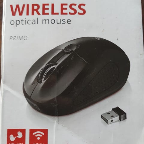 Trådløs datamus med ergonomisk design for komfortabel bruk. Drives av batterier, med avtakbar bakdeksel for batteriskifte.