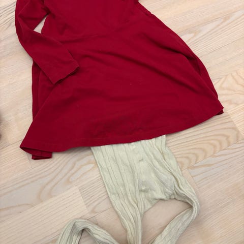 KappAhl barn kjole sett i størrelse 98/104 designet for jenter. Settet består av en rød kjole laget av bomull, med tilhørende lue og forkle i matchende farger.