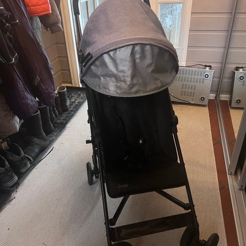Barnevogn med ramme i metall og sete i grått stoff. Sammenleggbar modell med fire doble hjul. Egnet for barn.