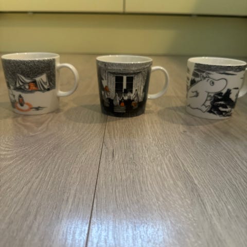 Arabia Mummi krus sett med 9 stk. Krusene har forskjellige motiver fra Mummitrollet og er laget i keramisk materiale. 5 av krustypene er utgåtte modeller. Mummipappa - 2022 , fuzzy -2019, stinky -2021, 2stk har likt motiv med mummitrollet 2018, også disse utgått. . Sniff tyrkis- 2024