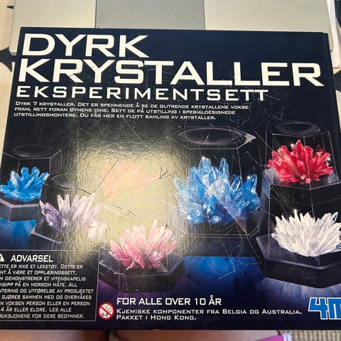 Et stort sett med alt du trenger for å gro dine egne krystaller. Her kan du dyrke fem ulike krystaller. Bland alle delene og se en unik krystallform vokse, ingen krystaller blir like. Ingrediensene er giftfrie. Bruksanvisning på norsk følger med.