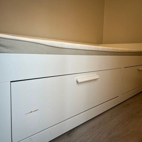 De to store skuffene gir mye plass til dyner, puter og sengetøy.